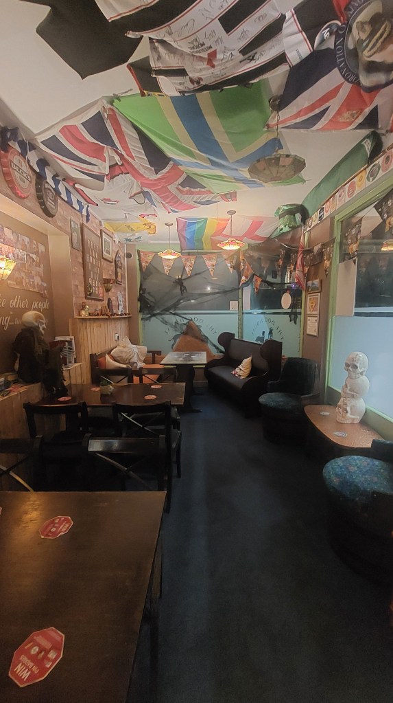 Conversation centres for a moment on the cobwebs and spiders covering the walls and windows the only thing missing is the cauldron miss Blackbrow uses to conjure up the magical potions passed across the bar in exchange for the local currency. For a moment somebody was brave enough to contemplate the fact that its nearly Halloween and that would account for the décor but then kept this to themself so as not to upset the balance of the local dialect